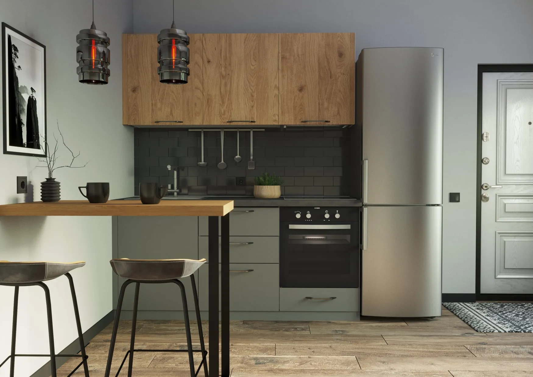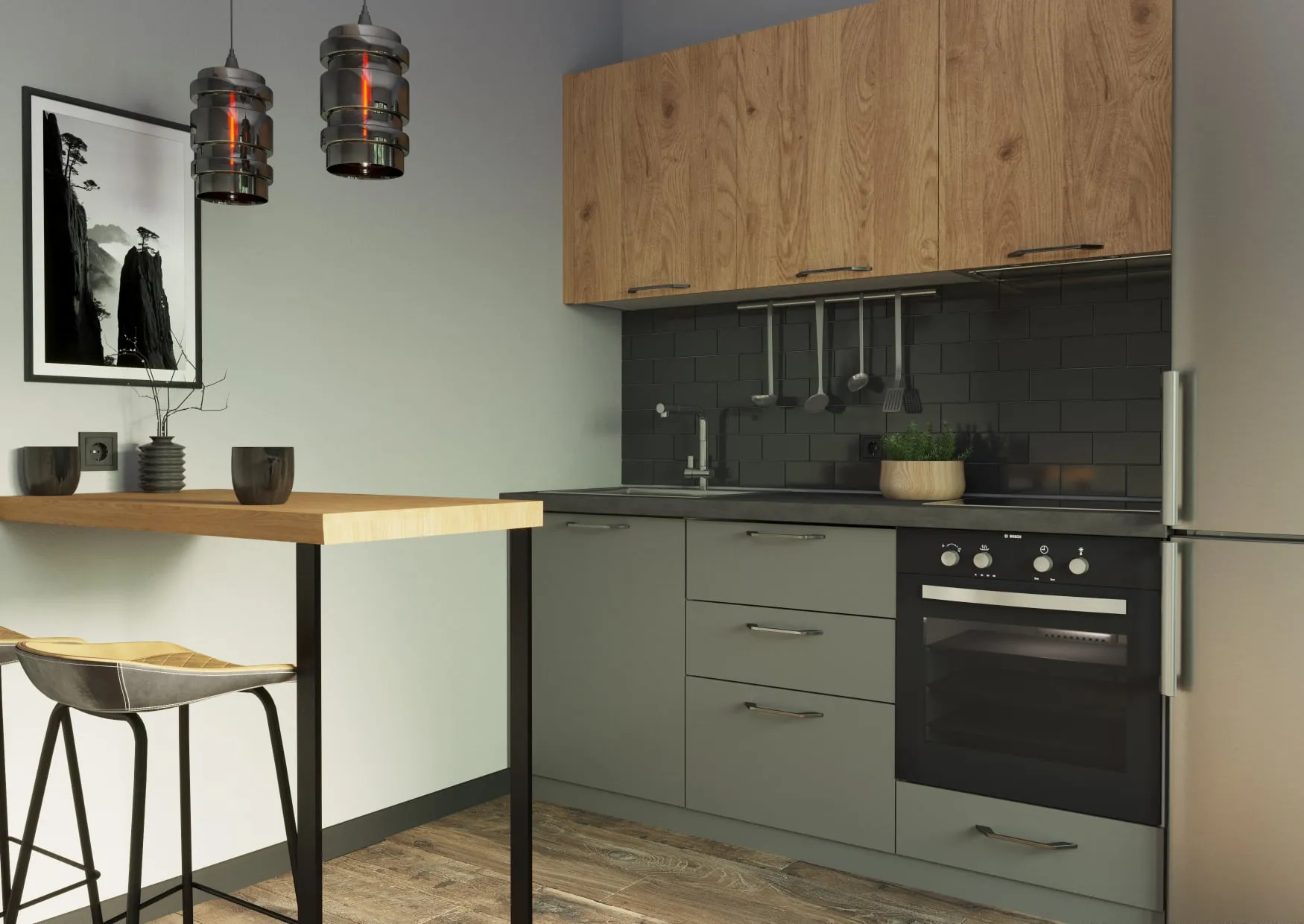 Фасады: ДСП-2 Дуб медовый-18 верт./ ДСП-2 Серый пыльный-18.