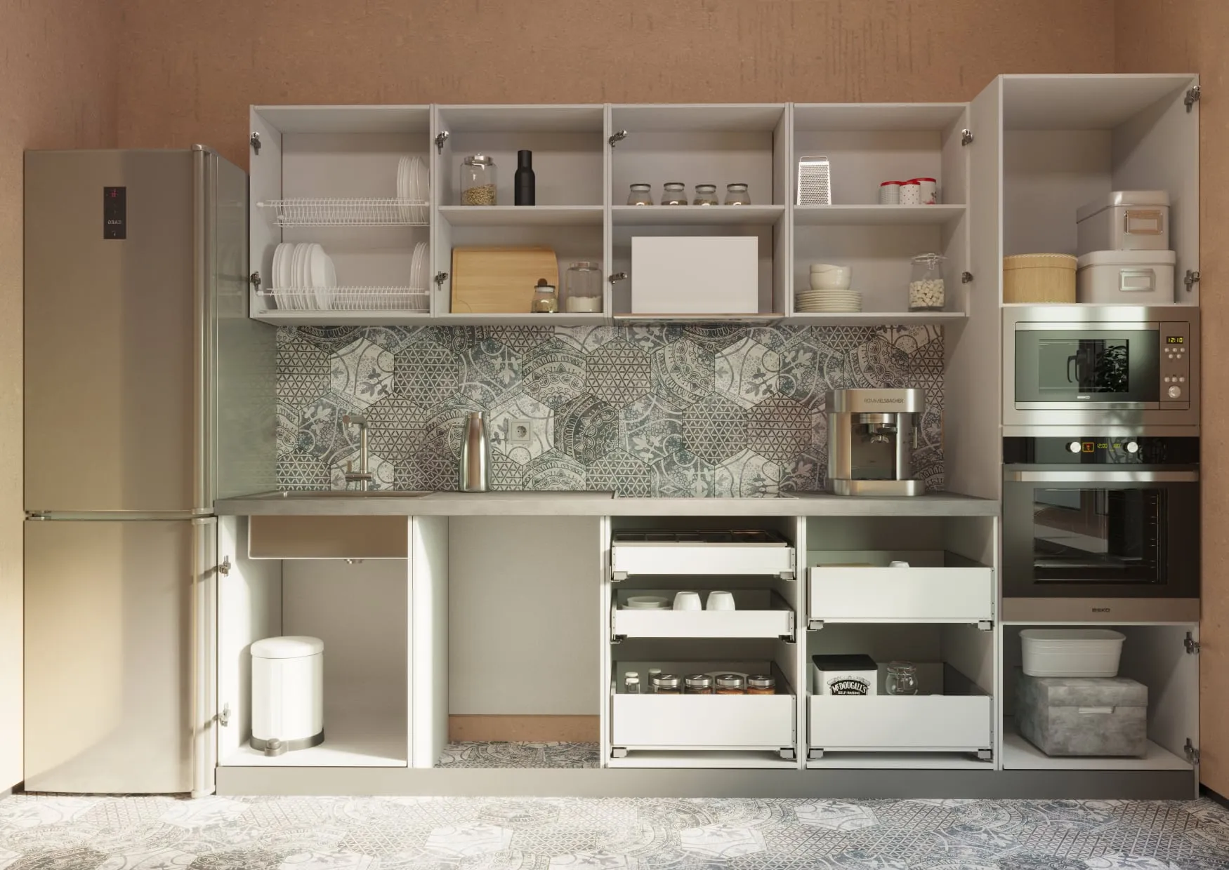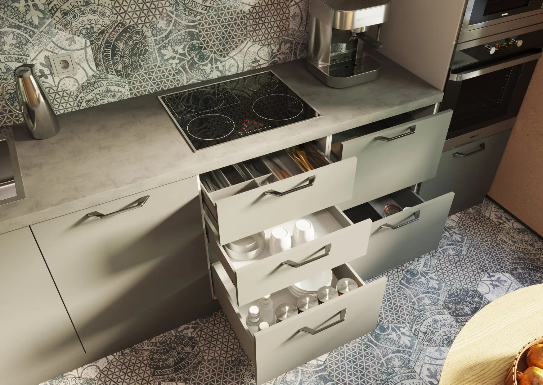 Механизмы открывания: петли BOYARD с доводчиком, направляющие Quadro 25 (Hettich)