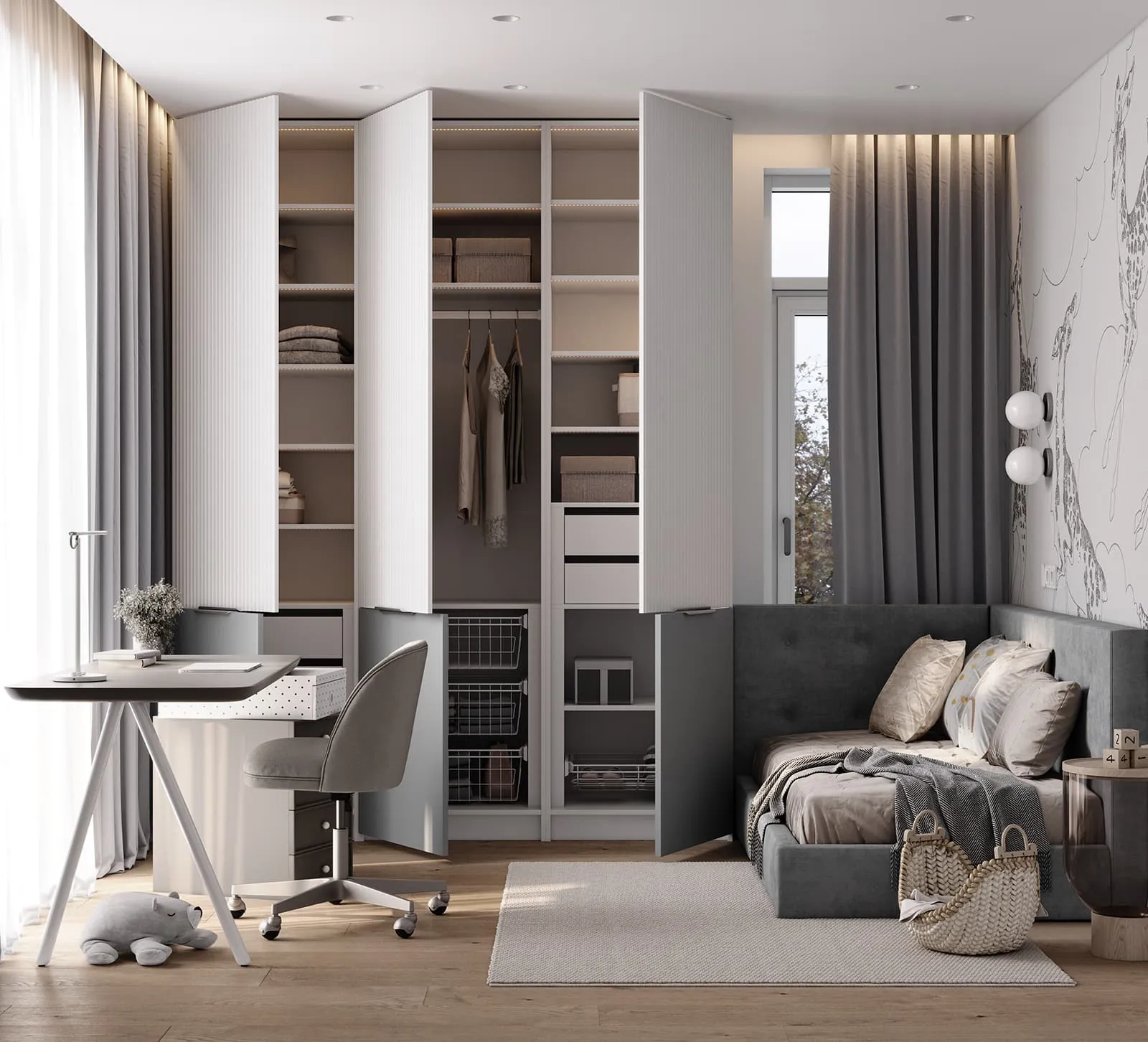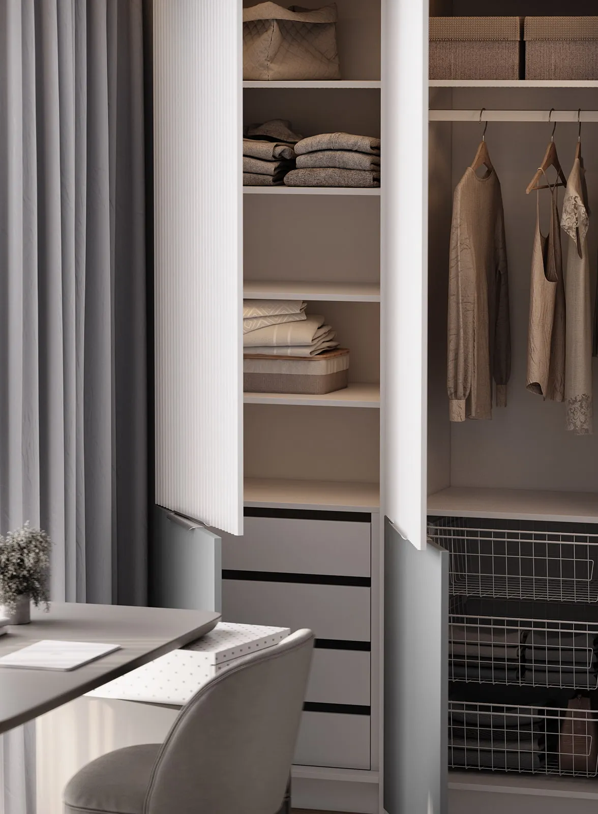 Фасады: Флавио (крашеная МДФ), цвет NCS S 1000-N Глянец / «Система» (крашеная МДФ), цвет NCS S 3010-B10G Матовый Каркас, полки, выдвижные ящики / задняя стенка: ЛДСП Белый Премиум / Белый Цены носят справочный характер