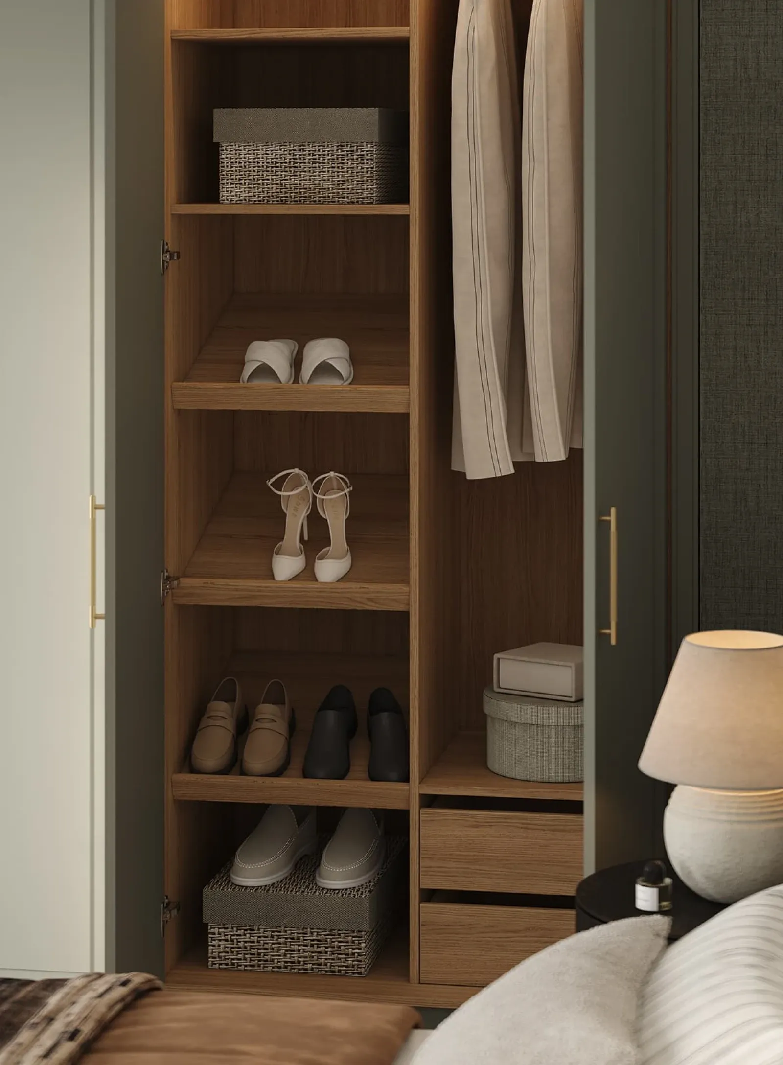 КАРКАС, ПОЛКИ, ВЫДВИЖНЫЕ ЯЩИКИ, ЗАДНЯЯ СТЕНКА ЛДСП, декор Дуб Медовый / крашеная МДФ, цвет NCS S 3005-G20Y Матовый ФАСАДЫ Т654 Крашеная МДФ, цвет NCS S 3005- G20Y Матовый