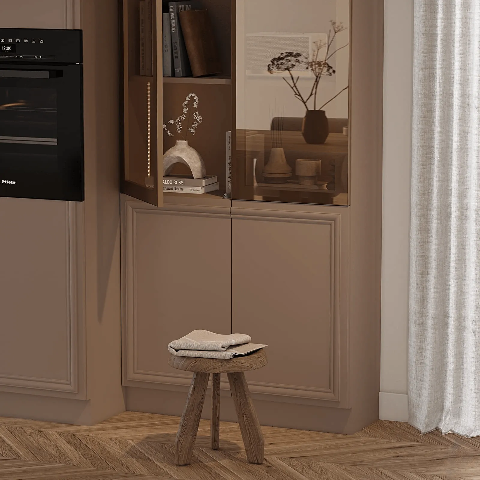 Фасады: Т622 Крашеная МДФ, Т649 Крашеная МДФ / массив ольхи, цвет NCS S 5005-Y50R Матовый / NCS S 1500-N Матовый.