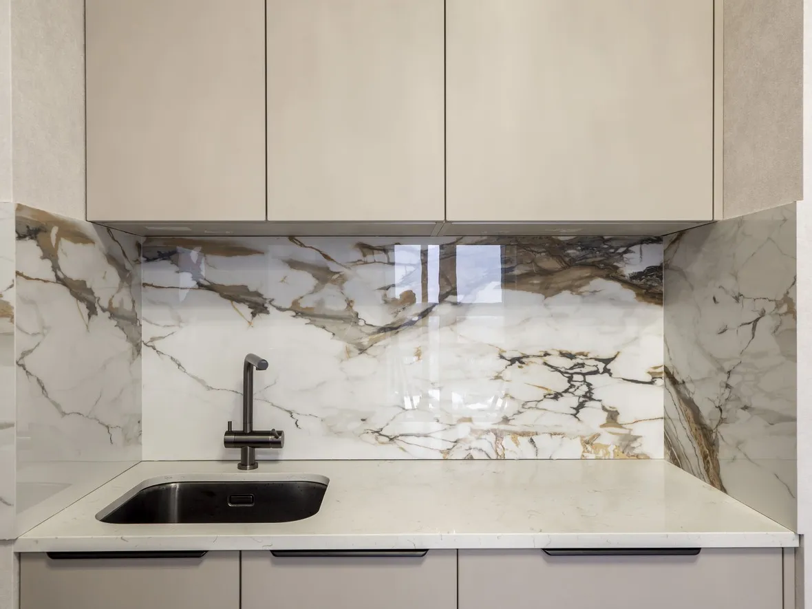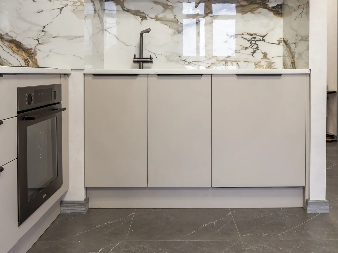 Техника: мойка и смеситель - EMAR, измельчитель - BONE CRUSHER, встроенный духовой шкаф, встроенная электрическая варочная панель, встроенная СВЧ, встроенная вытяжка, встроенная ПММ, встроенный холодильник - KORTING