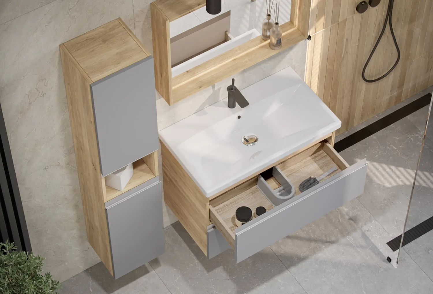 Корпус: ЛДСП Дуб Медовый Внутренний ящик Дуб Сонома, вырез под сифон Boyard серый